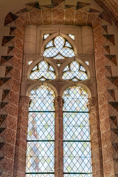 À l’intérieur, le regard change d’époque. Entre ces murs très anciens, une esthétique inattendue apparaît : des arches couvertes de motifs abstraits, des encadrements de fenêtres ornés de violettes, et des décors muraux qui semblent presque dialoguer avec notre regard d’aujourd’hui.