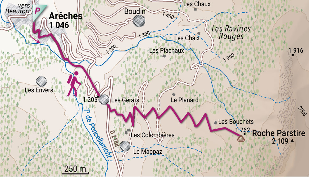 Si vous voulez prendre votre temps et préférez évoluer sur un profil peu pentu, vous pouvez suivre la piste qui grimpe jusqu’en haut de l’alpage. Si vous souhaitez un itinéraire plus direct, il vous suffit de monter en direction de l’est, droit vers la Roche Parstire (2 109 m). L’objectif de votre parcours se trouve au niveau du dernier chalet, juste sous la falaise (1 762 m), un peu plus en amont du chalet « les Bouchets » qui, lui, se trouve à 1 699 m.