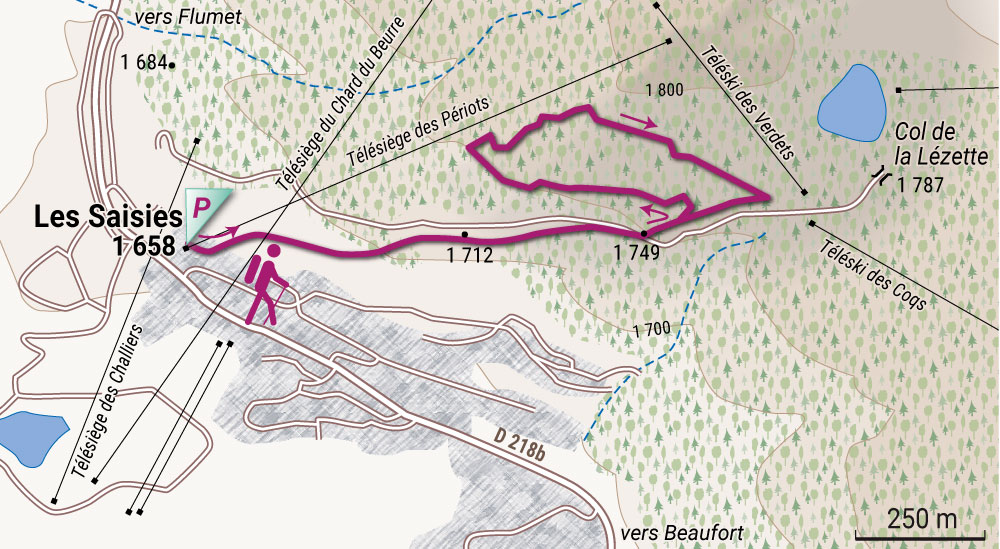 Votre randonnée débute devant la gare de départ de la piste de luge Mountain Twister. Prenez la piste piétonne qui passe au sud du bâtiment et qui remonte en direction de l’est. Au bout d’un kilomètre, traversez avec précaution la piste de ski des Blanchots. Au bout d’une centaine de mètres sur votre gauche, une banderole vous indique Sentier raquettes, forêt des Saisies.