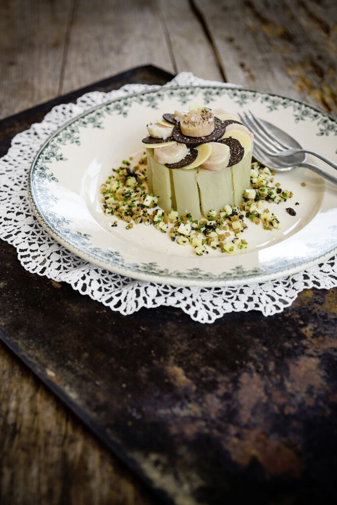 Alain les accommode avec un peu de moelle de bœuf, une émulsion au beaufort, et quand Noé et moi [Delphine] sommes sages, le dimanche, Alain nous ajoute des lamelles de truffes Tuber melanosporum… Allez ! À table ! Bel hiver…
