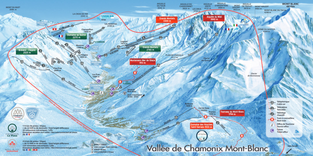 La vallée de Chamonix, parcourue par 121 pistes, est réputée pour satisfaire chaque skieur. Voici le détail des pistes :